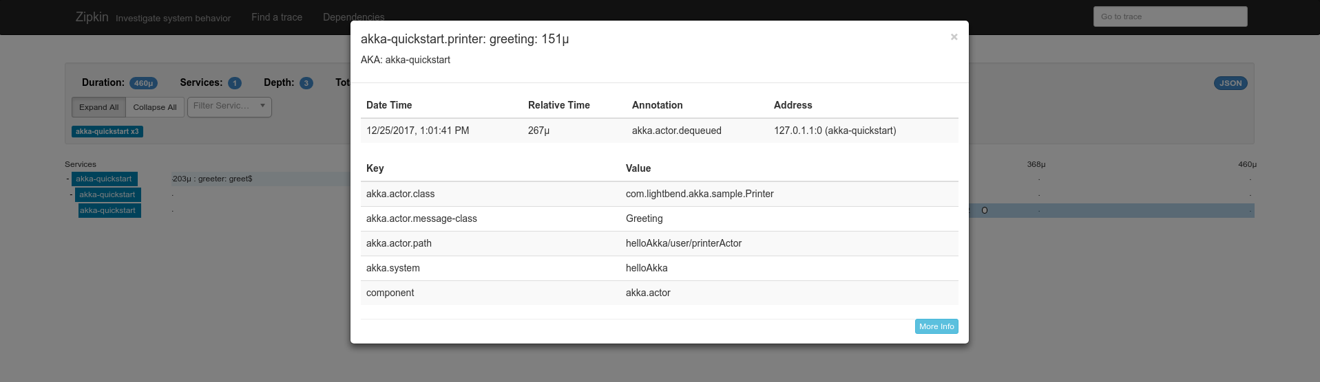 The kamon-zipkin module translates Kamon’s representation of Spans and sends them to Zipkin’s v2 API.